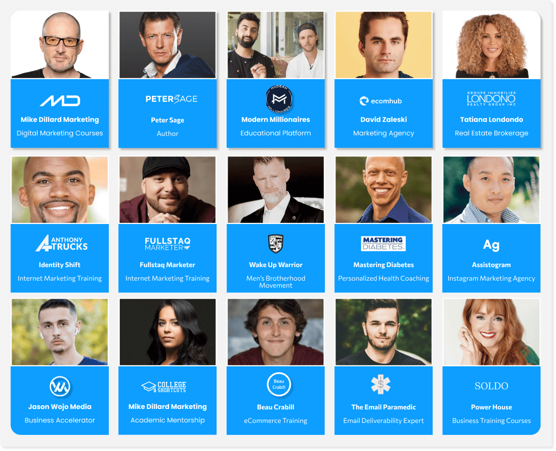 Trusted by industry leaders like Grant Cardone, Mike Dillard, Garrett J. White, Peter Sage, Tatiana Londono, Carolin Soldo, Keala Kanae, Troy Ericson, Beau Crabill, Chance & Abdul, David Zaleski, Jason Wojo, and many others.